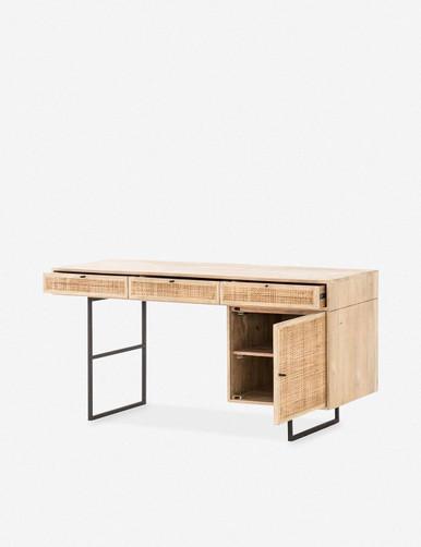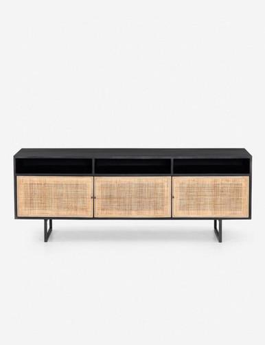 The two organic, woven cane doors on this small cabinet add warmth and visual texture to any space you place it in. A pair of small, circular pulls provide tailored elegance, while an angular, gunmetal base infuses our Hannah console with crisp, modern touch.